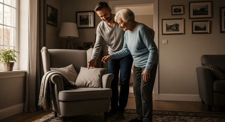 A smiling man helps an elderly woman stand up from an armchair in a bright living room. The scene depicts family support, elder care, and the loving relationship between a son and his aging mother.