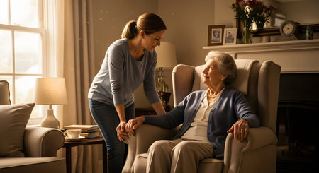 A younger woman leans in to comfort and talk with an elderly woman sitting in an armchair in a cozy living room. The warm lighting highlights the bond of care, family support, or professional caregiving in a home setting.