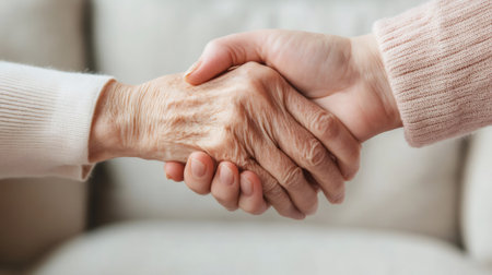 Two elderly individuals share a warm handshake, their hands showing signs of age with wrinkles and tenderness. The scene captures a moment of connection and compassion between them.