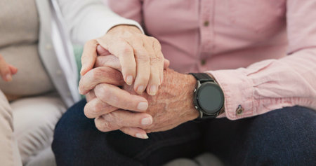 Closeup of old couple, man and woman holding hands for love, care and trust in retirement. Senior partner, loyalty and helping hand for kindness, sorry and support to forgive, hope or empathy at home