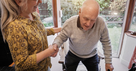 Senior Caucasian woman sitting in wheelchair with disability, Black man standing behind gently placing hand on her shoulder, both partially visible in indoor setting