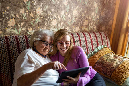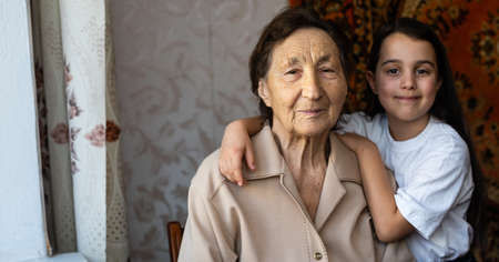 An elderly woman grandmother and a young girl hold hands. Support for the elderly from young people and children. Caring for retired old people.