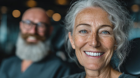 illustration of a contented elderly couple with gray hair and white, flawless teeth, separated on a blue backdrop with text space. dental attention. artificial teeth. dental care