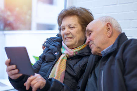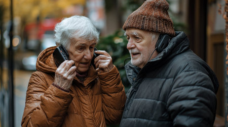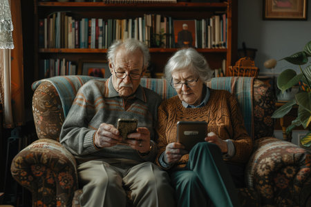 An elderly couple sit together, deeply engrossed in their smartphones, bridging the generational tech gap.