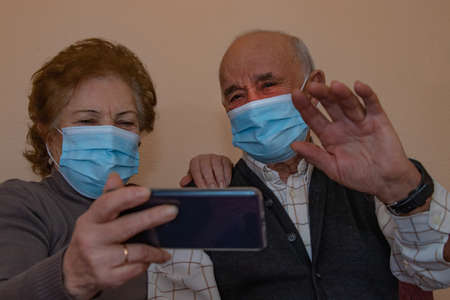 happy senior couple busy on making video call using smartphone at home - concept of technology, bonding and connection