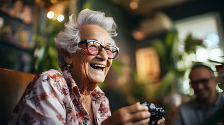 Happy mature woman having fun in geriatric clinic or or nursing home