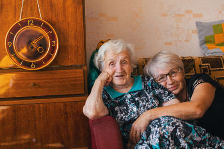 An elderly woman with her adult daughter sitting in an embrace on the couch.