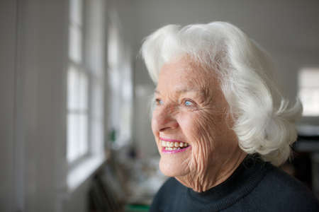 Charming senior woman with grey hair and glasses, wearing a winter coat, photographed indoors with a warm, joyful expression. Captures calmness and beauty of aging in a well-lit and friendly environment.