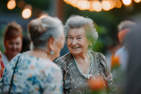 Senior woman joyfully smiling while seated among friends in a warm ambiance.