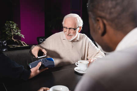elderly man in eyeglasses paying with cellphone through terminal near blurred african american friend