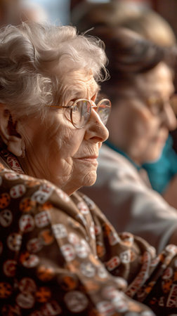 A thoughtful elderly woman adorned with vibrant glasses sits silently, her expression reflecting deep contemplation in a softly lit, cozy space.
