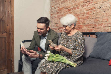 handsome caucasian man and his loving cheerful mother watching old photos. High quality photo