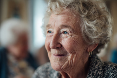 Close-up portrait of elderly woman with gray curly hair wearing knitted sweater smiling indoors with other persons in blurred background