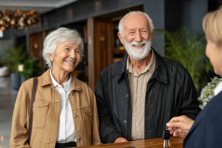 A couple of seniors happily check in at a hotel, smiling at the receptionist in a stylish, welcoming lobby filled with greenery.