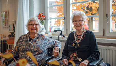 Two elderly women, in wheelchairs by a window, share a smile with each other, creating a heartwarming moment