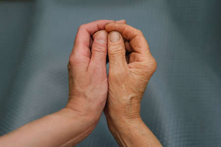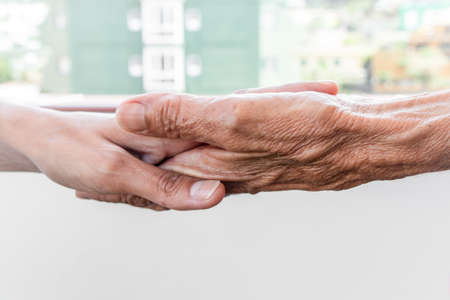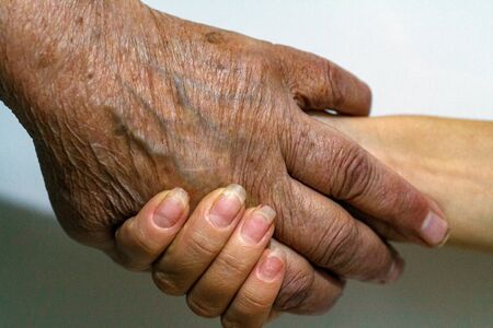 Parkinson disease patient, Alzheimer elderly senior, Arthritis person's hand in support of nursing family caregiver care for disability awareness day