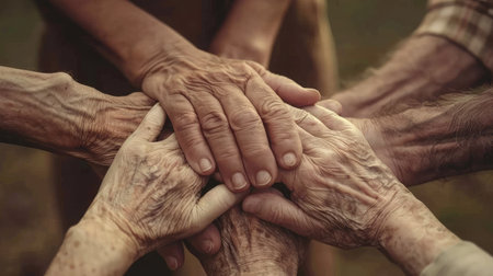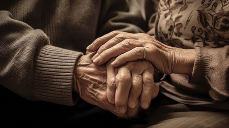 Two elderly individuals share a warm handshake, their hands showing signs of age with wrinkles and tenderness. The scene captures a moment of connection and compassion between them.