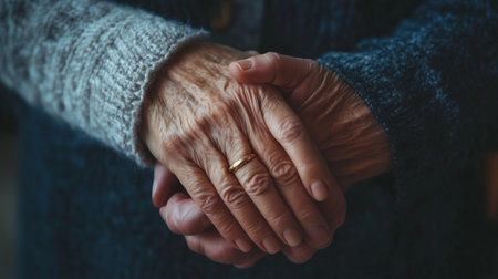 Elderly person’s hands clasped together, showcasing wrinkles, a gold ring, and warm knitwear in a softly lit indoor setting
