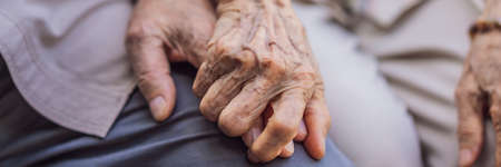 BANNER, LONG FORMAT Elderly couple holding hands with love. Hand of an elderly woman holding the hand of an elderly man