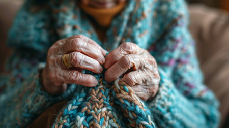 Close up shot of an older persons hand held by a younger persons hand, resting on a crocheted blanket Expresses warmth, comfort, and support