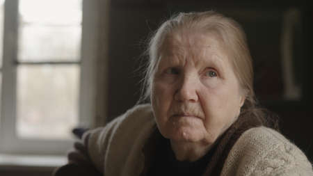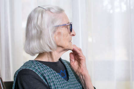 Portrait of elderly worried caucasian grandmother with glasses on her nose. Lonely retirement concept. High quality photo