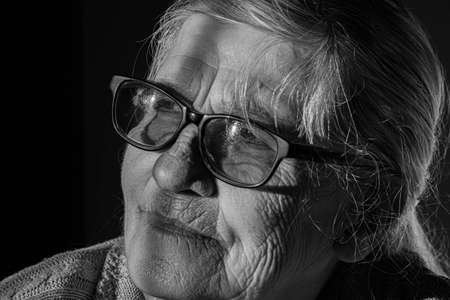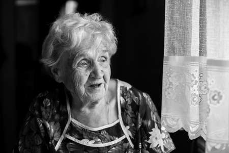 Portrait of an elderly woman in his house. Old lady retired. Black and white photo.