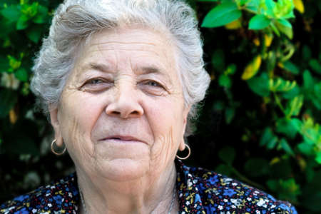 Senior Caucasian woman head and shoulders portrait against green plants, looking at camera