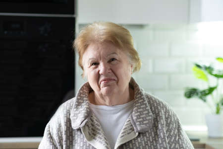 Old age concept. Portrait of a very old and tired of life wrinkled woman near the window in the bedroom of her house. Sad and depressed older woman alone