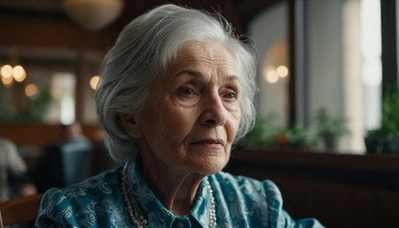 Senior woman looking away out of windows while sitting in a cafe shop. Space for copy text. Concept of aged people and travel
