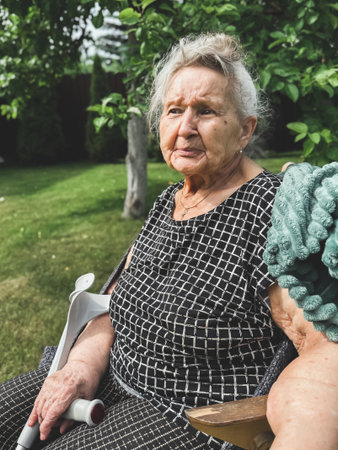 Elderly woman 80-90 years sitting outdoors in a garden with a thoughtful expression, wearing a patterned dress and holding a crutch, surrounded by greenery and sunlight, aging concept