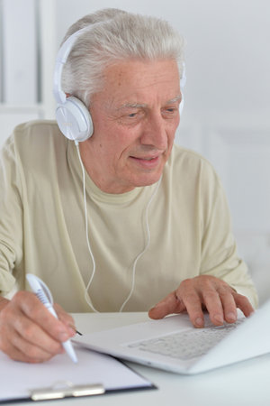 Eldery man using laptop computer at home.