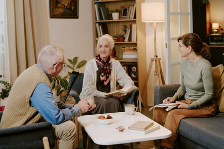 Senior woman sitting between middle aged man and middle aged woman, holding book and smiling while engaging in conversation in living room setting