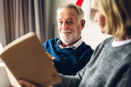 Portrait of happy senior couple in living room, Elderly woman and a man reading a book on cozy sofa at home, Happy family concepts