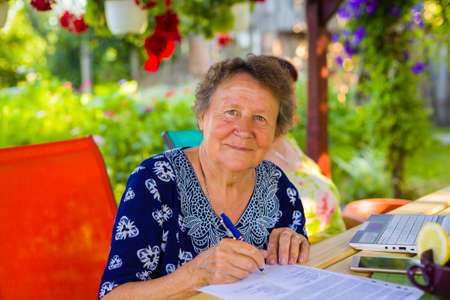 Cheerful retired woman writing about her inheritance in her floral garden.