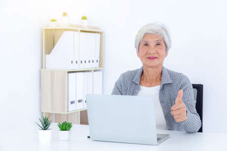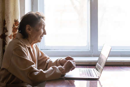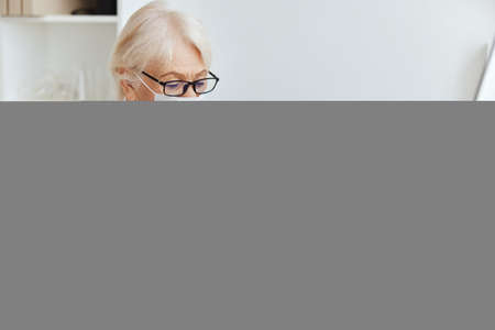 Old retired woman studying working on the computer.