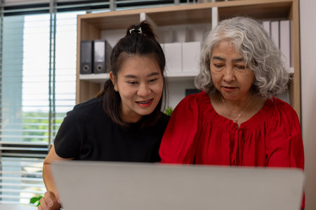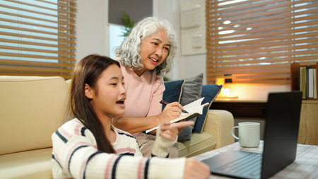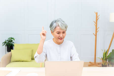 Happy senior Asian using the laptop for calculating and make a note of daily expenses. Concept of lifestyle, learning, and finance business