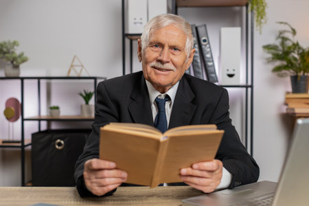 Bored Caucasian senior businessman reading book, literature, taking a rest after work. Grandfather freelancer guy in suit with laptop relaxing with head in hand at home office table. Business people.