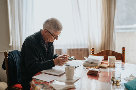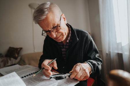 Elderly man studies documents at home, writes with pencil and uses magnifying glass.
