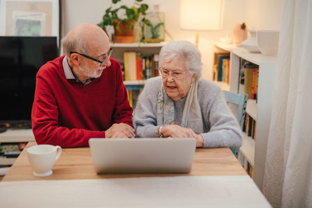 Loving elderly couple makingn online reservation, using laptop.