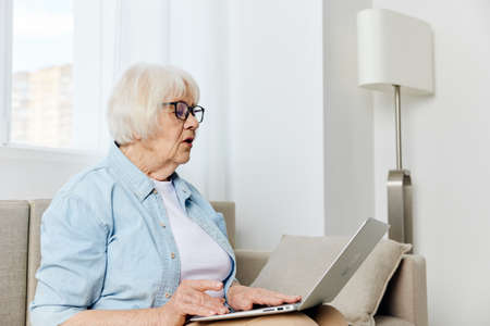 Happy senior woman using laptop at home. Technology and the elderlyconcept.