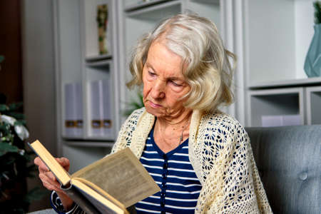 Lonely elderly woman reading a book at home for Christmas.