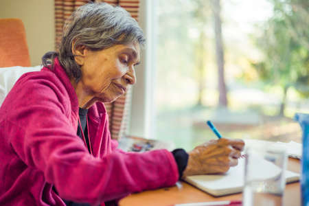 Old elderly Asian Indian woman sitting writing in a journal or notebook, UK. Depicts memory loss and keeping a list or diary.