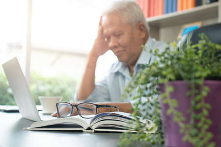 An elderly man reading news with the tablet on the desk at home. An old Asian man is searching for information on the Internet while sitting at a table.