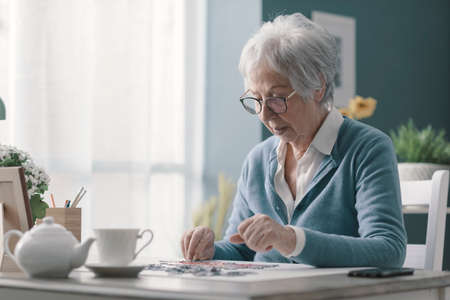 Happy senior woman playing puzzle at home alone and having tea