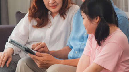 Asian grandparents and granddaughter using tablet at home. Senior Chinese, grandpa and grandma happy spend family time relax with young girl checking social media, lying on sofa in living room concept