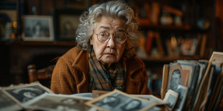 Elderly woman with a glasses surrounded by old photographs, reflecting on memories in a vintage room.
