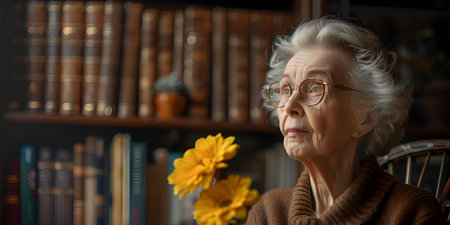 Elderly lady with flower in hand standing by a bookcase contemplative. Concept Portrait photography, elderly woman, flowers, bookcase, contemplative mood