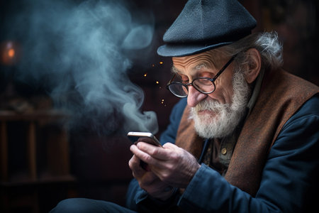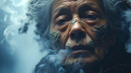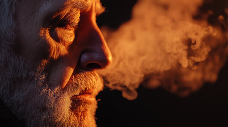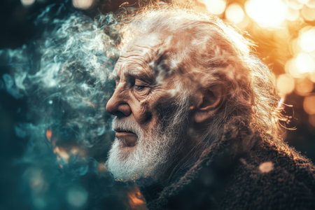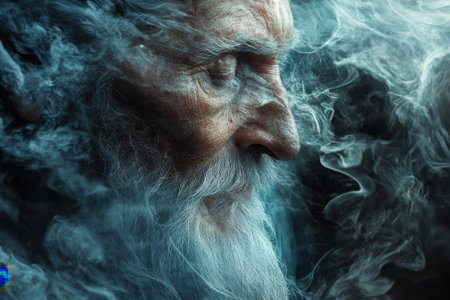 An elderly man contemplates deeply, his face partially obscured by ethereal wisps of smoke, highlighting serenity.