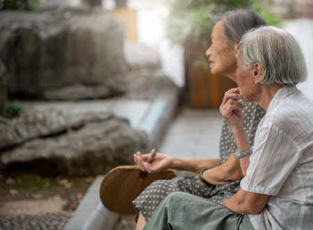 Guilin, China - August 2019 : Portrait of two old retired chinese asian women sitting on a bench by the Shan Lake in a park in summer