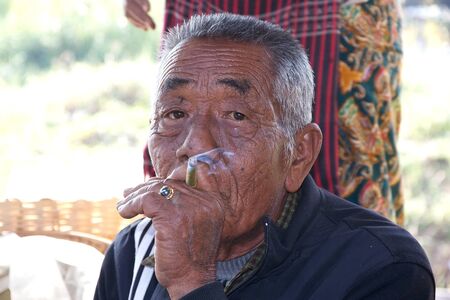 Burmese man is smoking a cigar at the Nan Pan village market on the Lake Inle, Shan State, Myanmar